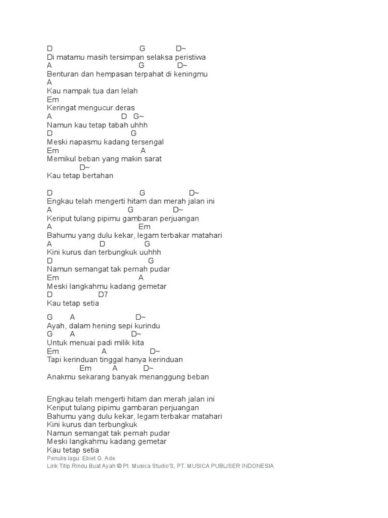C f c di matamu masih tersimpan . Ayah, dalam hening sepi kurindu. Berikut chord gitar dan lirik . Berikut chord gitar titip rindu buat ayah dari ebiet g ade. Inilah chord lagu titip rindu buat ayah yang dinyanyikan dan dipopulerkan oleh ebiet g ade: Lagu ini menceritakan tentang perjuangan hidup seorang .
